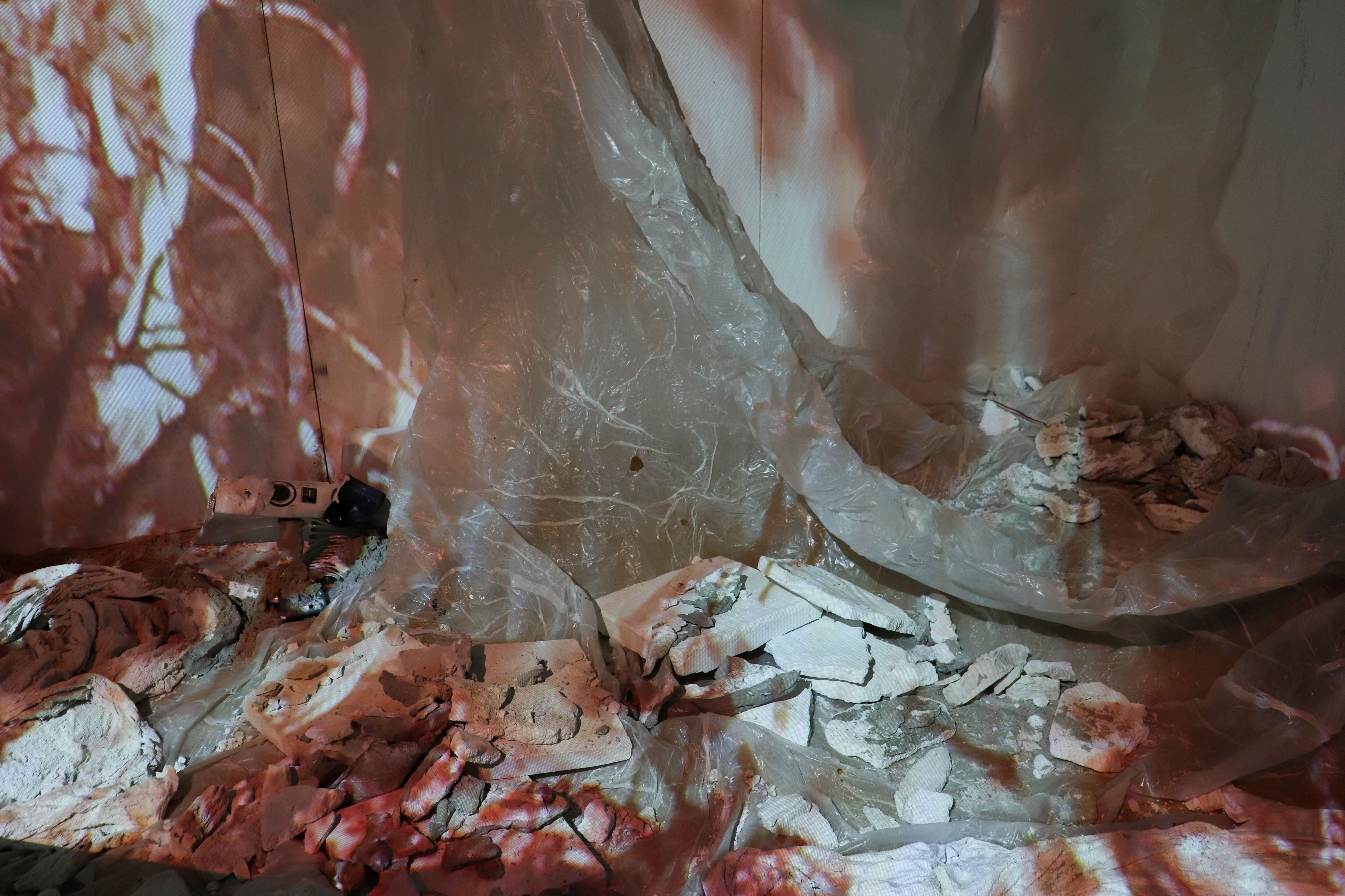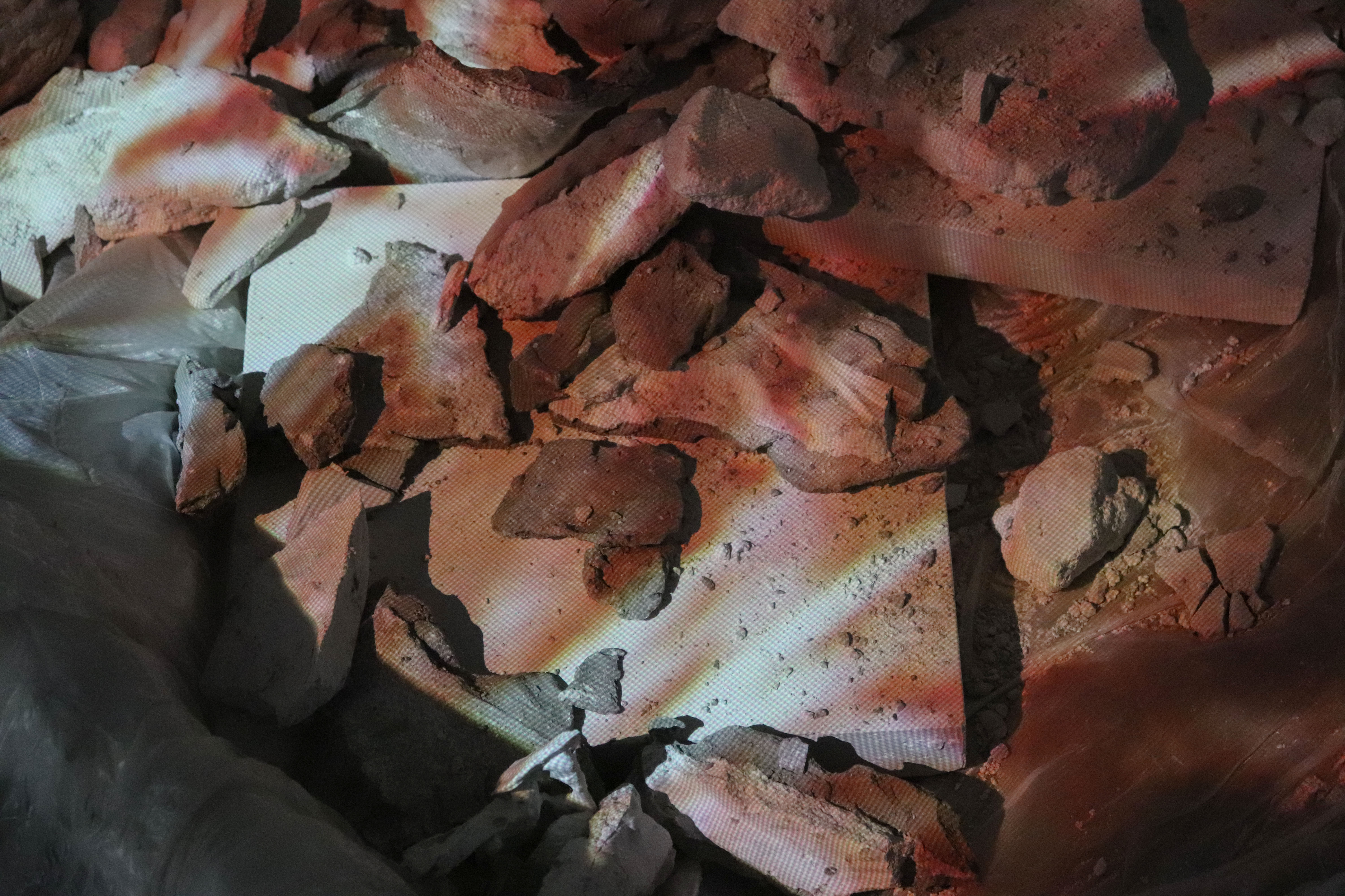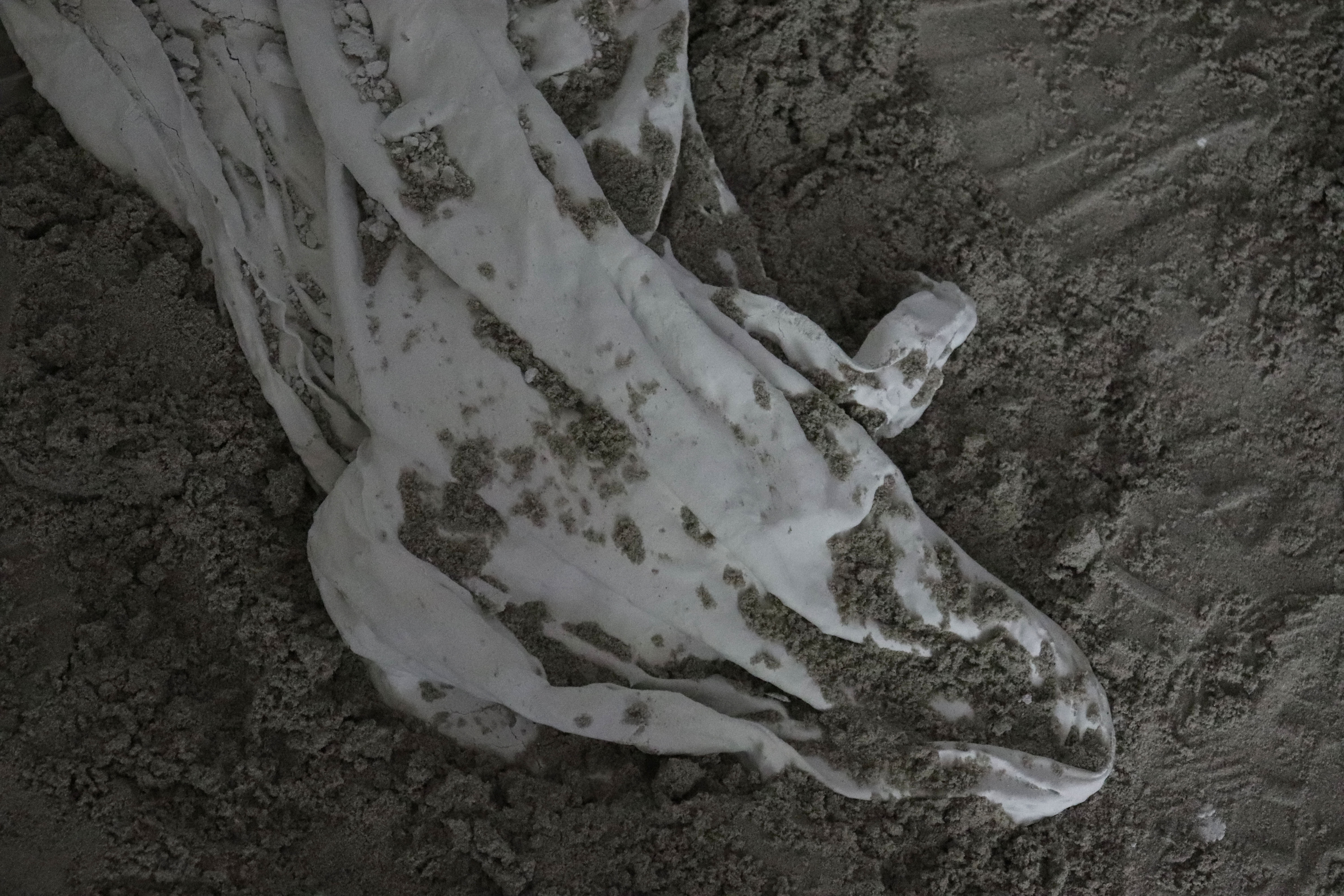 Plaster, clay, sand, wax, plastic, text, video and sound (2023)